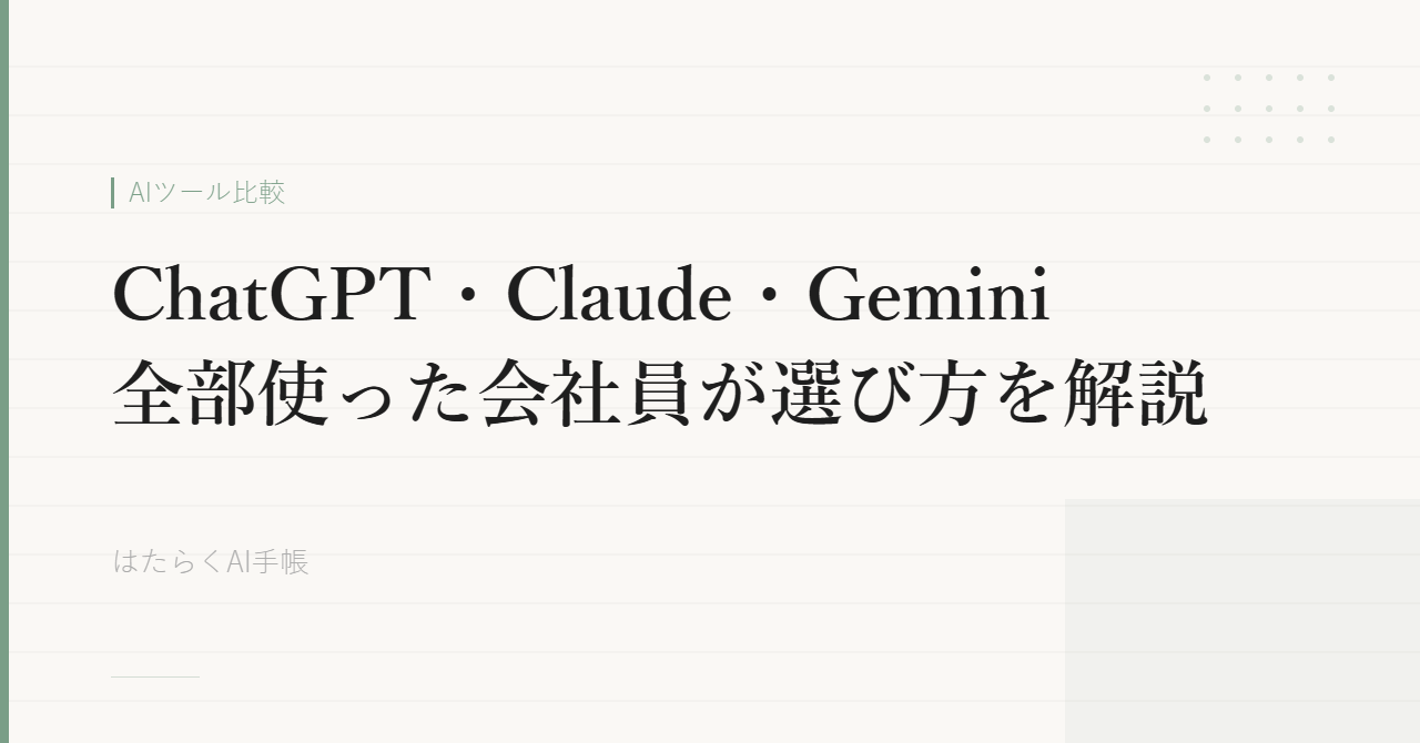 AIツール比較 【2026年最新】ChatGPT・Claude・Gemini徹底比較|全部使った会社員が選び方を解説 AIツールを使ってみたいけど、種類が多すぎて何から始めればいいかわからない。 この記事ではChatGPT・Claude・Geminiを実際に全部使い続けている筆者が、それぞれの特徴と選び方をわかりやすく解説します。 結論だけ先... 2026.03.21 AIツール比較